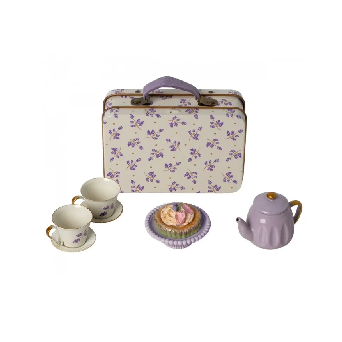 Afternoon treat från Maileg Tekanna, temuggar, tårta och tårtfat i lila färger allt samlat i en resväska i plåt Tillbehör till mössen