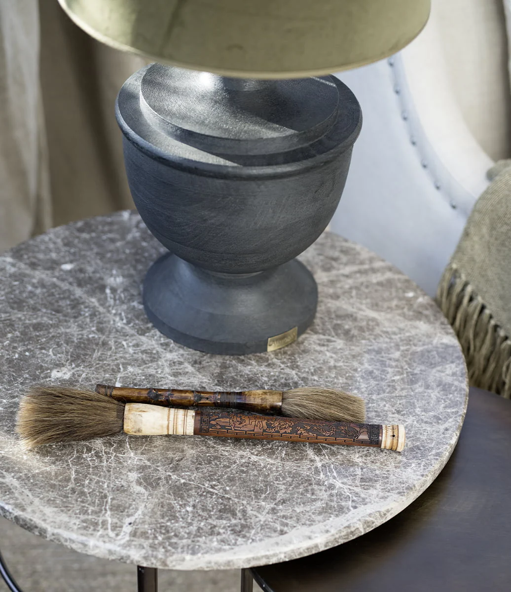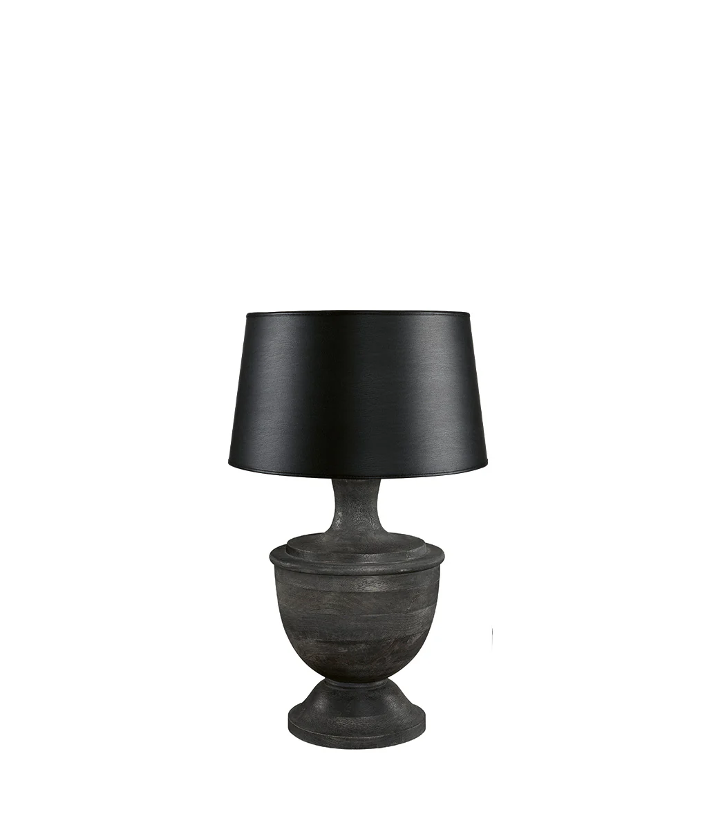 En klassisk urnformad bordslampa, tillverkad av antikt trä i färgen rustik svart med en antik finish. Lampan har en svart textilsladd med strömbrytare som smälter in i de flesta inredningsstilar. Eftersom trä är ett naturligt material kan färgen och finishen variera, vilket gör varje lampa unik med sin egen karaktär. Lampskärm ingår ej. Lampskärmen på produktbild: Lampskärm Classic i storlek medium