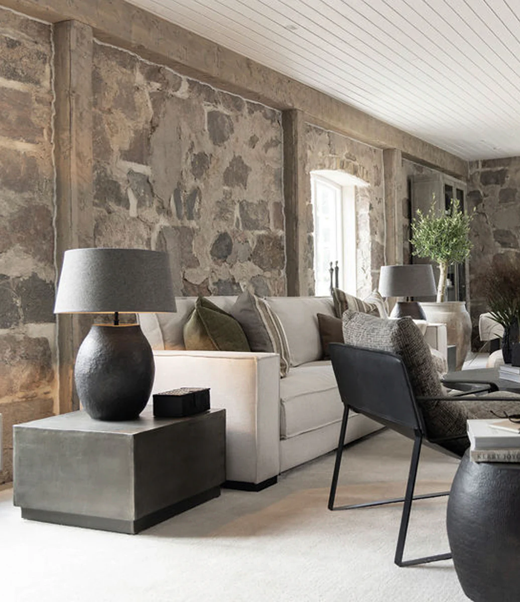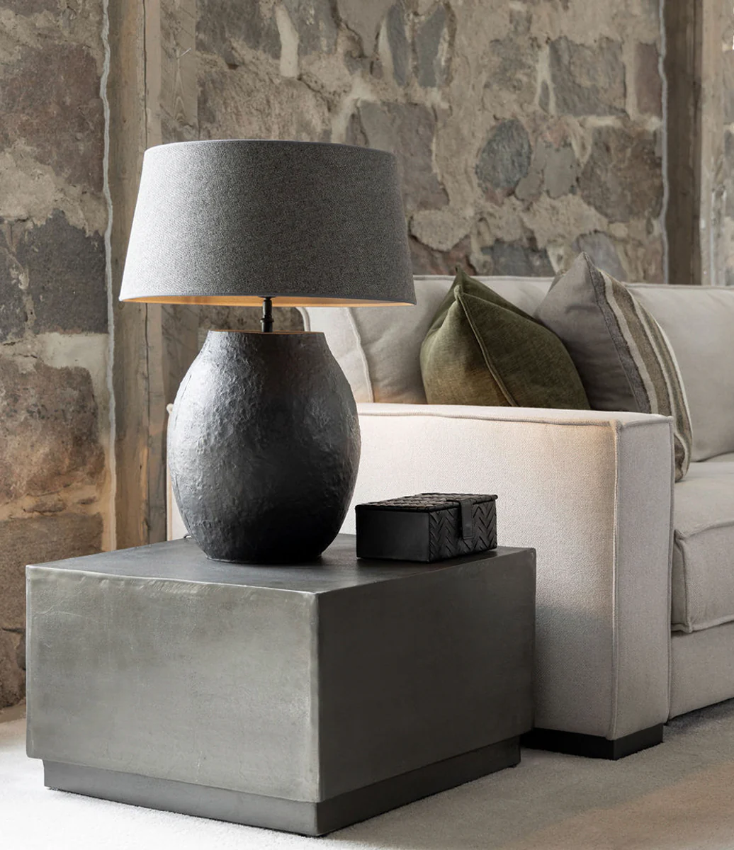 Bordslampa i metall med en lätt strukturerad yta. Lampan har en svart textilsladd med strömbrytare. Kräver en E27-lampa på max 40w. Lampskärmar och ljuskällor ingår ej. Till produktbilden används lampskärm Classic i storlek large.