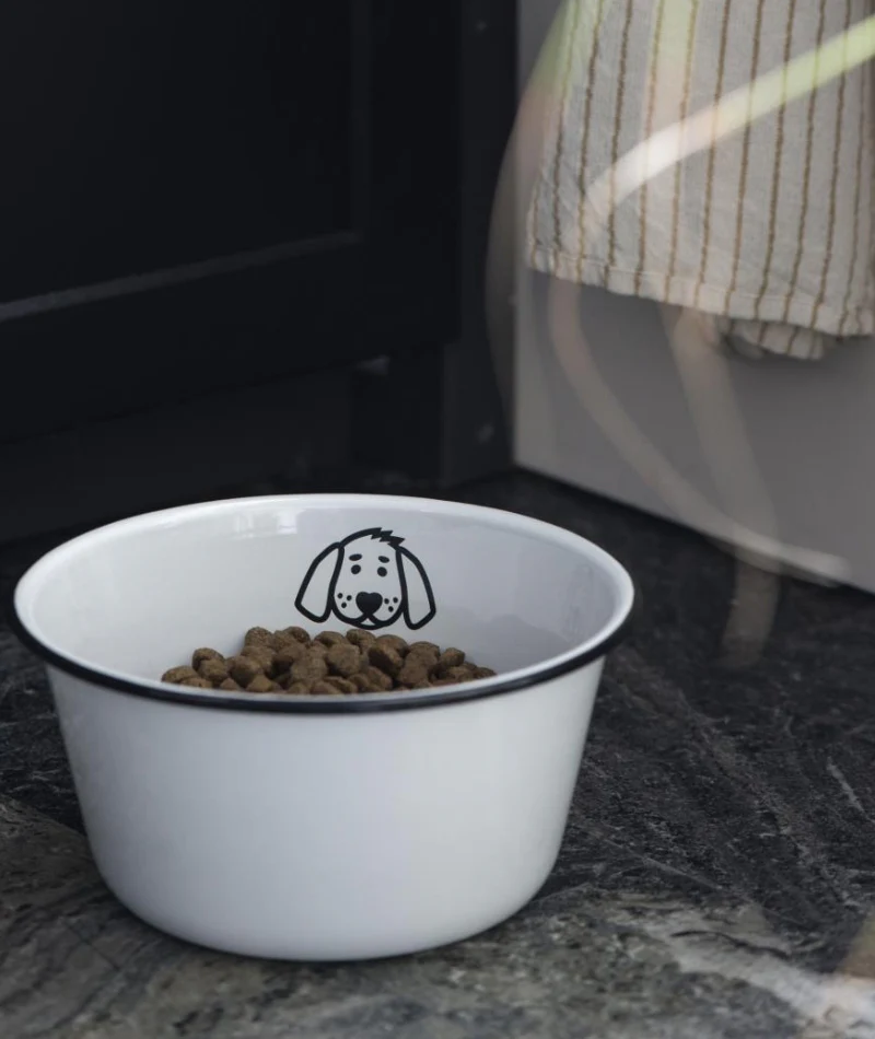 En stilren och hållbar hundskål i klassisk design. Tillverkad i vit emalj med svart kant som ger ett tidlöst uttryck och passar fint i alla hem. Perfekt för både mat och vatten, en praktisk detalj med snygg finish.