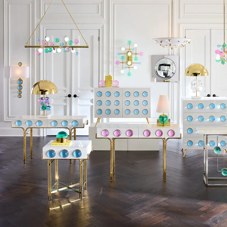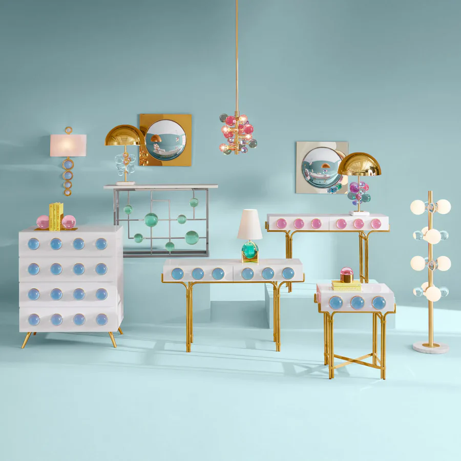 Kliv in i en värld av drömlika klot och cabochoner. Detta sidobord Globo som även fungerar utmärkt som sminkbord har ett glansigt vitt lackskåp omslutet av en böljande mässingsram och dekorerad med lysande rosa akryl-cabochoner infattade i polerad mässing. Utformad för att passa i mindre utrymmen, men med en högvoltsglamour som också gör intryck i större rum.