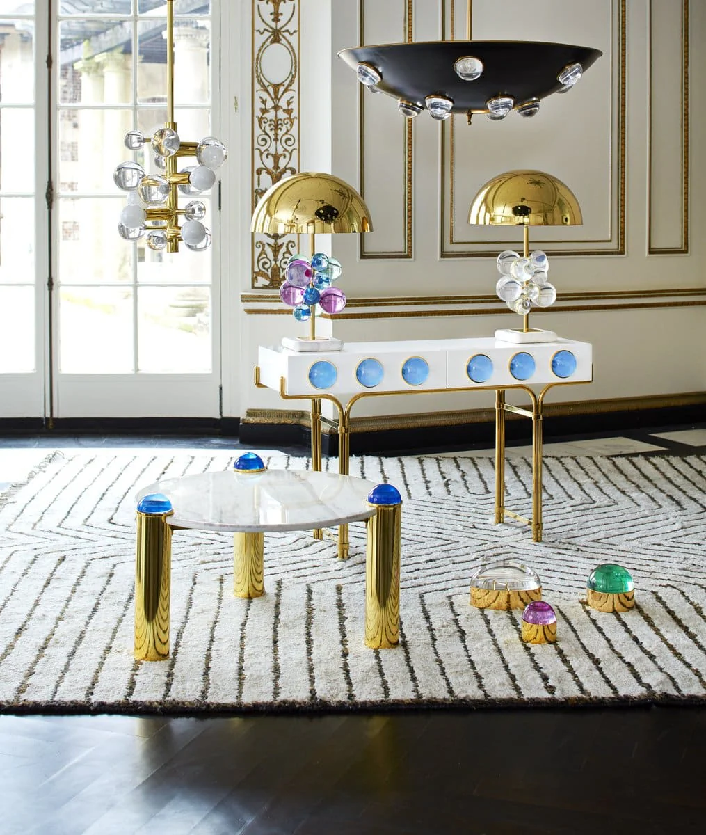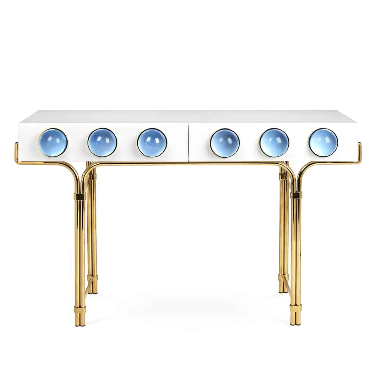 A glossy, white lacquer cabinet cradled by a sinuous brass framework and capped with blue solid acrylic cabochons. Small footprint but big impact, our Globo Console is guaranteed to deliver mega glamour.