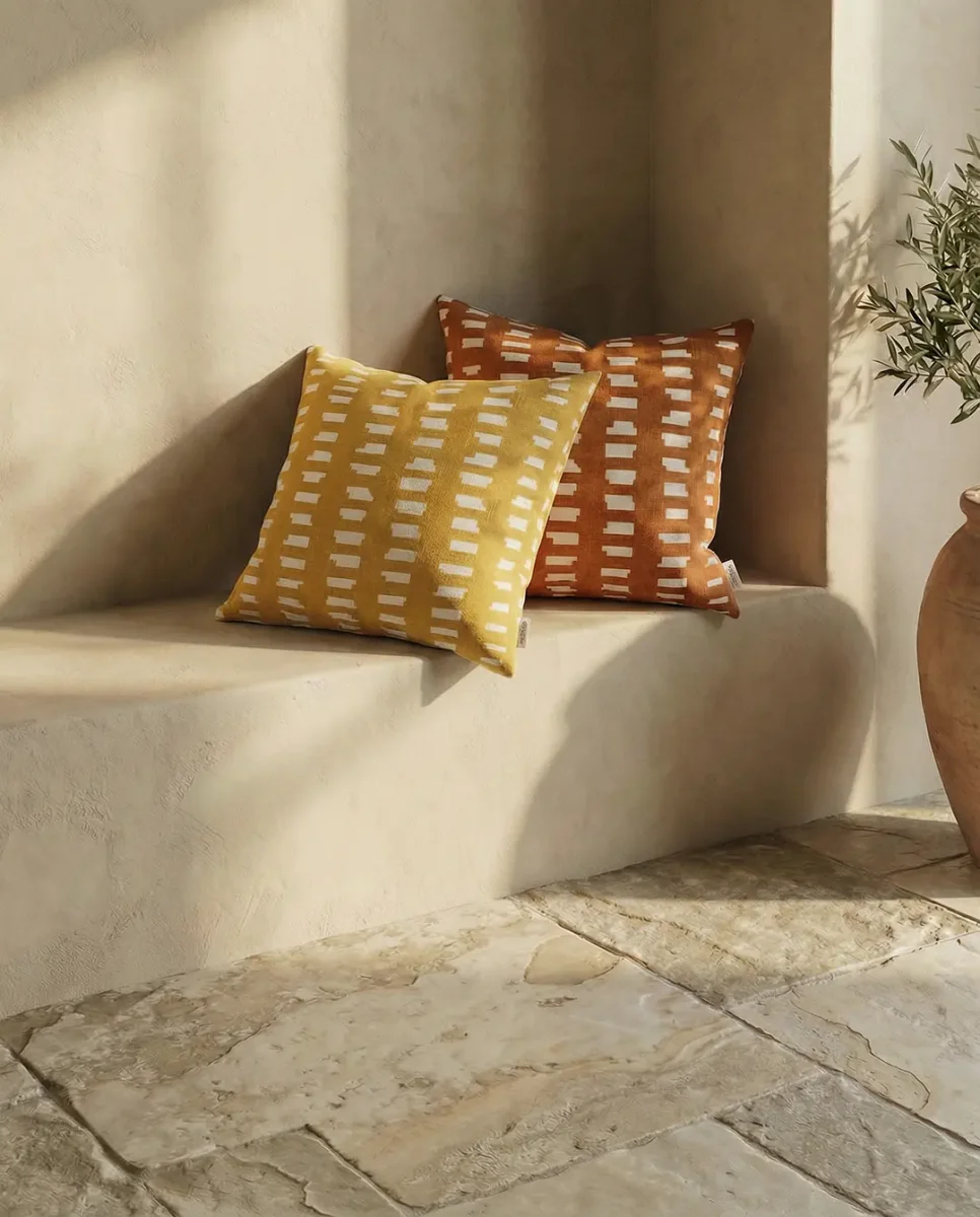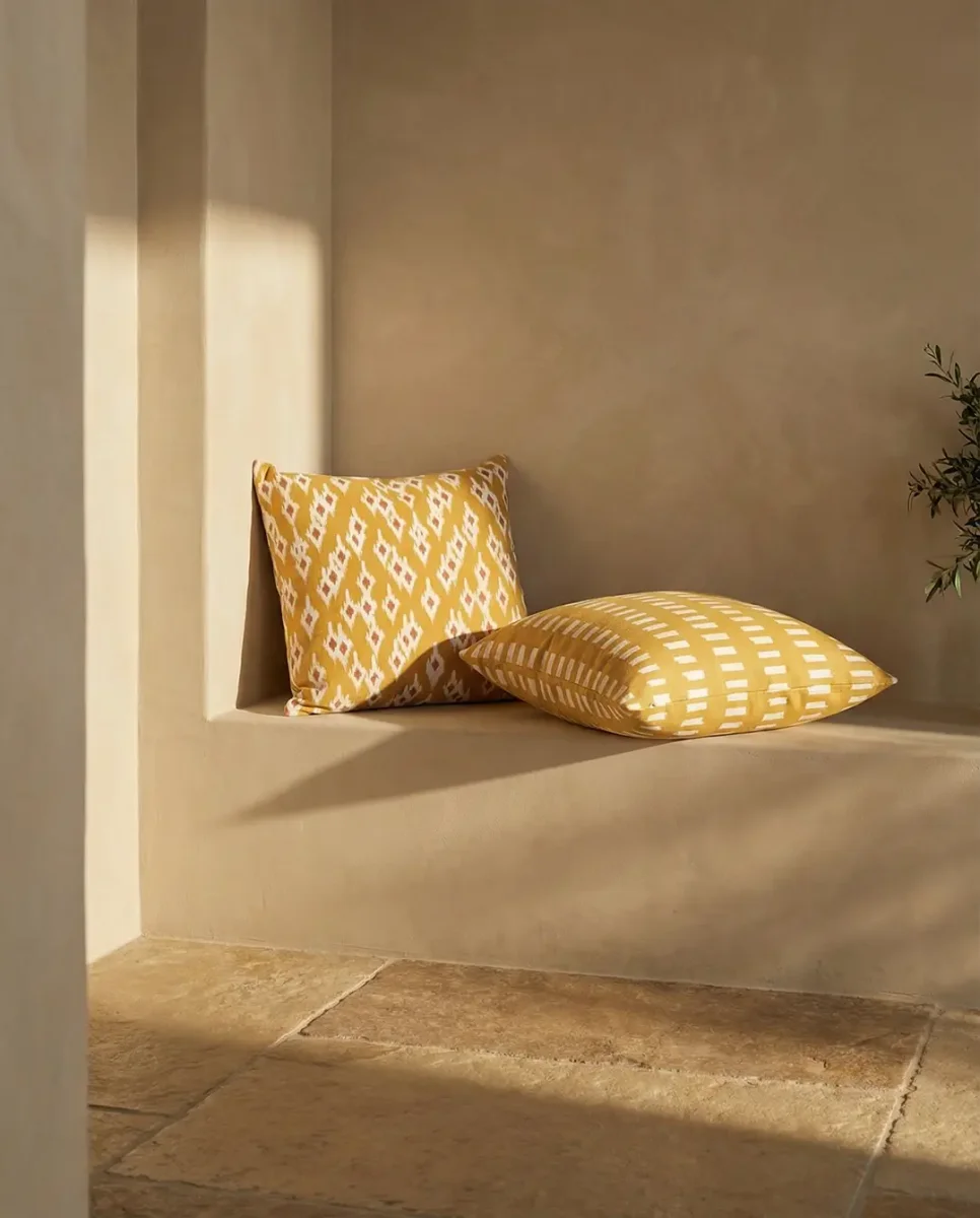 Ikatmönstrat kuddfodral i varm ockra
