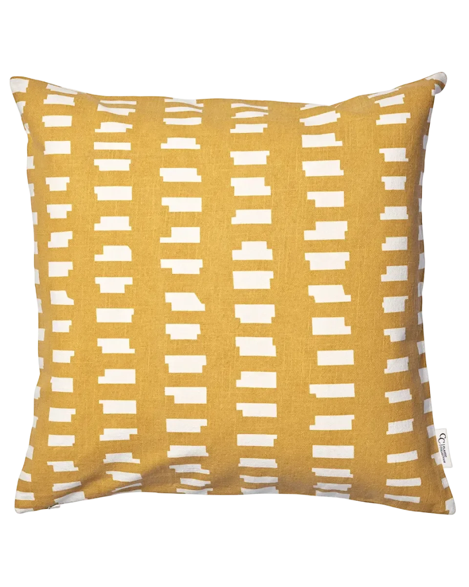 Ikat Block Ockra är ett kuddfodral i 100 % bomull med ett grafiskt mönster av asymmetriska block, inspirerat av traditionell ikat-teknik. Den varma ockragula botten bryts av med benvita partier och ger soffan, fåtöljen eller sängen en tydlig men lättkombinerad färgaccent.