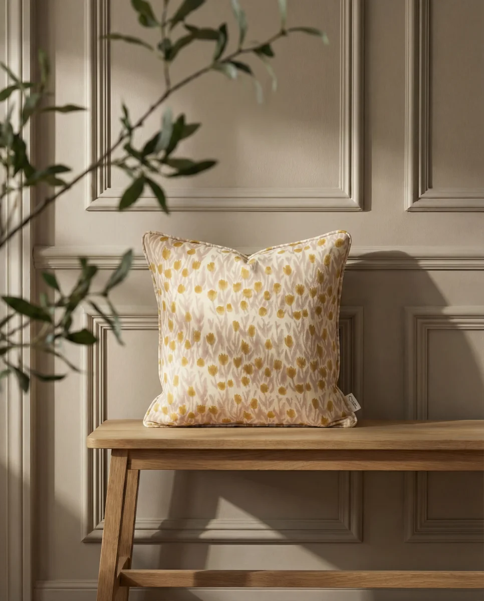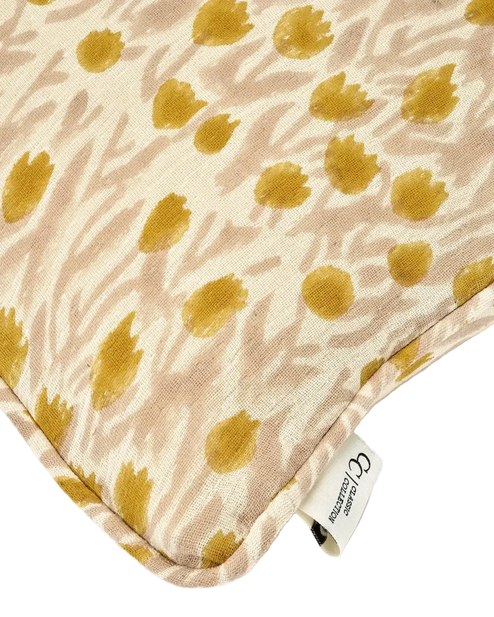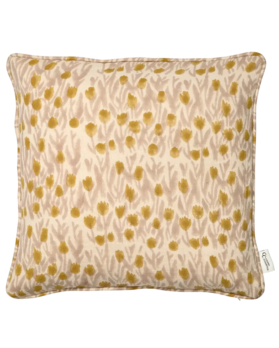 Kuddfodral Tulip i färgen Gul är tillverkat i bomull med ett livfullt mönster i blockprint. Kuddfodralet ramas in av en dekorativ passpoal som ger en stilren inramning. Storleken 50×50 cm gör det till ett enkelt sätt att skapa variation i soffan eller på sängen.