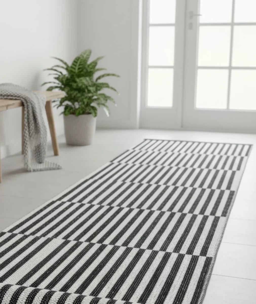 Plastmatta Stripes i svart/vitt, perfekt för både inomhus- och utomhusmiljöer. Vändbar.