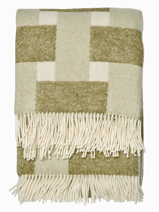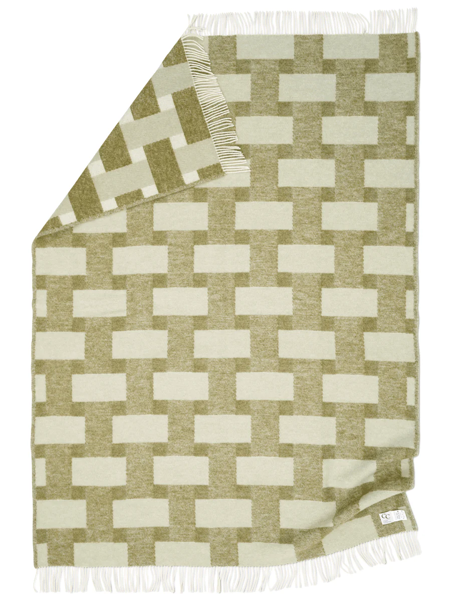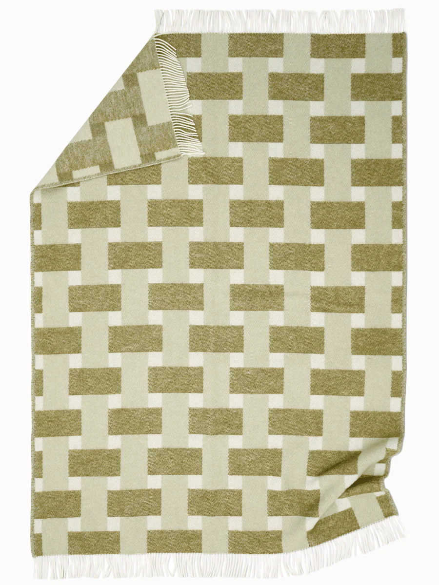 Weave Grön är en jacquardvävd pläd i 100% ull från Nya Zeeland. Mönstret bygger på överlappande band som ger intryck av en flätad struktur. Tack vare jacquardtekniken är pläden lika genomarbetad på båda sidor och kan användas vändbar för variation i soffan eller på sängen.