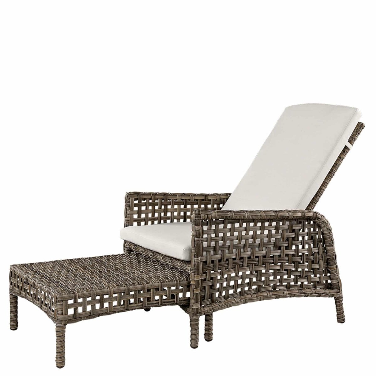 En mycket gedigen solstol med stomme i aluminium och snygg konstrotting som ger ett modernt och luftig känsla. Ställbart ryggstöd och dynor med avtagbar klädsel och fotpall som smidigt skjuts in och ut under stolen till önskad plats.