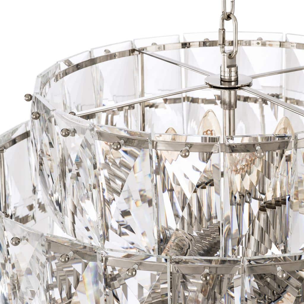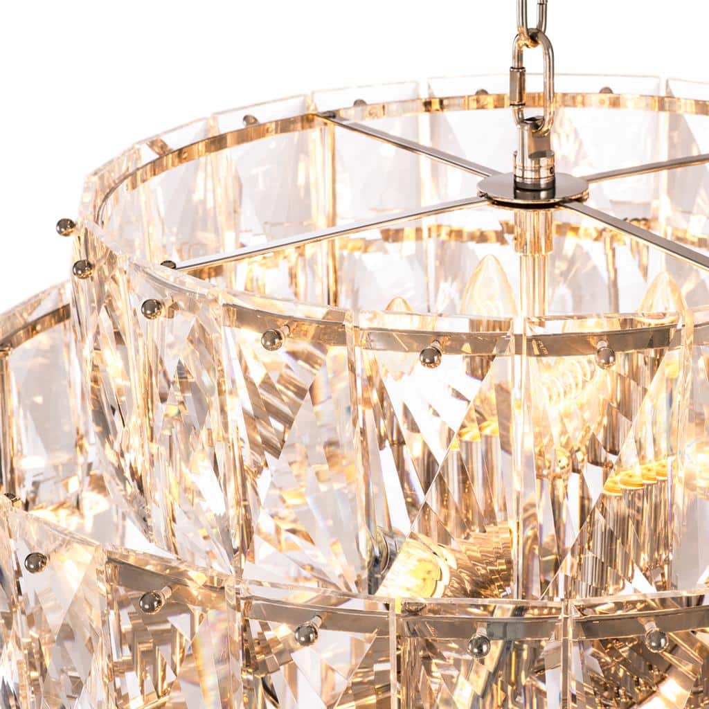 En stor och modern, exklusiv kristallkrona i nickelfinish och med kristallprismor i klart eller rökfärgat glas.