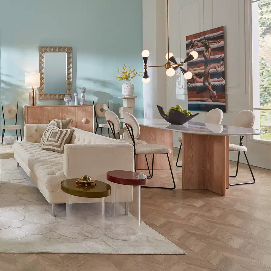 Enkla geometriska former – koner och sfärer – möts med dynamiska resultat i vår sexarmade juskrona Caracas. De tre armarna erbjuder oändliga konfigurationer: vertikalt för en klassisk känsla, horisontellt för ett mer strömlinjeformat utseende, eller vinklat för en oväntad touch. Lite industriellt, lite elegant och väldigt mångsidigt.